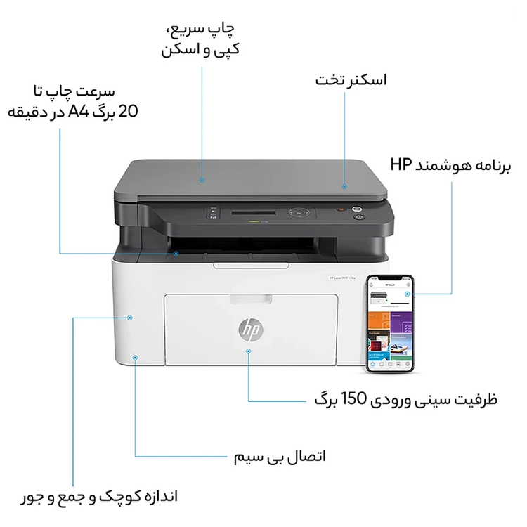 پرینتر چندکاره لیزری اچ پی مدل Laser MFP 135w از فناوری چاپ لیزری بهره میبرد که دقت و کیفیت بالایی را در چاپ اسناد فراهم میکند. این دستگاه با رزولوشن چاپ dpi1200*1200 قادر است اسناد را با وضوح بسیار بالا و جزئیات دقیق چاپ کند. سرعت چاپ این دستگاه 20 صفحه در دقیقه است که این ویژگی برای محیطهای کاری با حجم کاری متوسط مناسب است. همچنین، زمان خروج اولین صفحه چاپی حدود 8.3 ثانیه است. اسکنر تعبیهشده در پرینتر Laser MFP 135w از نوع تخت است که با رزولوشن dpi 600*600 قادر به اسکن اسناد باکیفیت بالا است. این اسکنر از فرمتهای مختلفی نظیر PDF، JPG و TIFF پشتیبانی میکند و با استفاده از نرمافزارهای مرتبط میتواند اسناد را بهراحتی مدیریت و بایگانی کند. همچنین، این دستگاه قابلیت کپی اسناد را نیز دارد و میتواند با رزولوشن dpi 600*600 کیفیت چاپ مطلوبی را ارائه دهد. اتصال به شبکه بیسیم یکی از ویژگیهای برجسته پرینتر Laser MFP 135w است. این دستگاه از Wi-Fi 802.11b/g/n پشتیبانی میکند که امکان چاپ بیسیم از دستگاههای مختلف نظیر لپتاپ، تبلت و گوشیهای هوشمند را فراهم میکند. علاوه بر این، پرینتر دارای یک پورت USB 2.0 برای اتصال مستقیم به کامپیوتر است. این دستگاه از اپلیکیشنهای موبایلی مانند HP Smart App نیز پشتیبانی میکند. کاربران میتوانند از طریق این اپلیکیشن بهراحتی عملیات چاپ، اسکن و کپی را انجام دهند. همچنین، قابلیت چاپ از طریق Google Cloud Print و Apple AirPrint از دیگر امکانات ارتباطی این دستگاه است که استفاده از آن را آسان میکند.